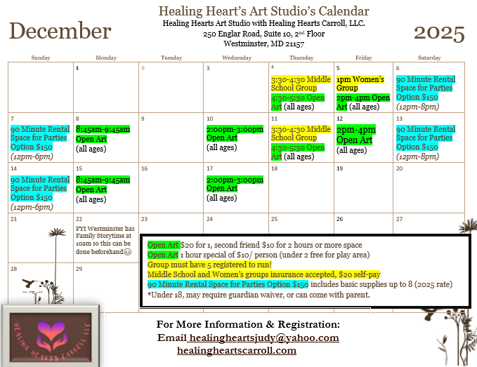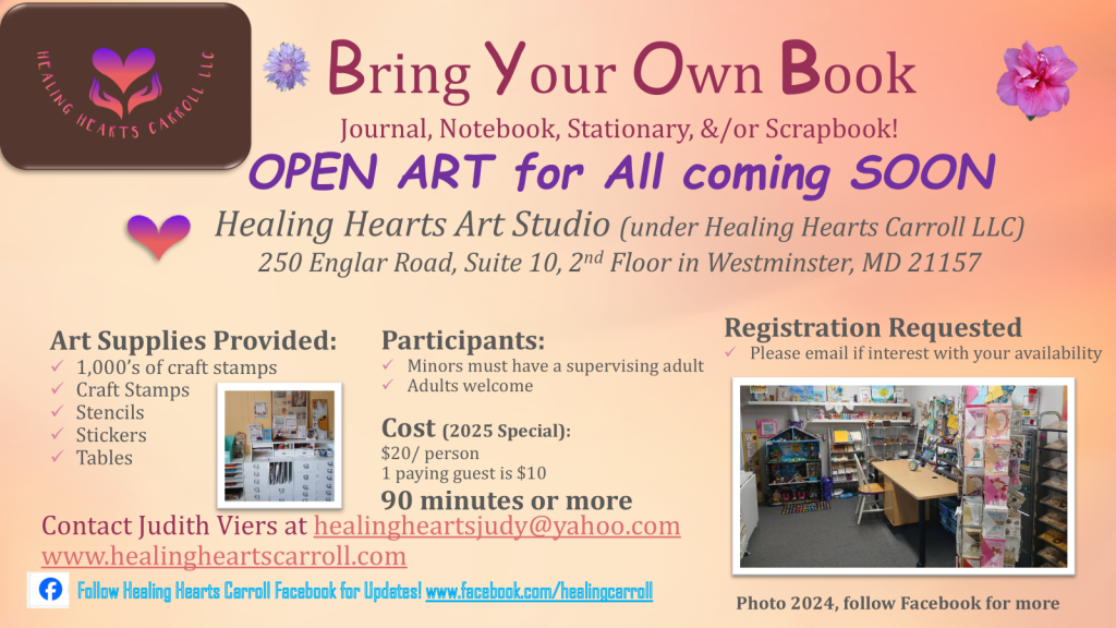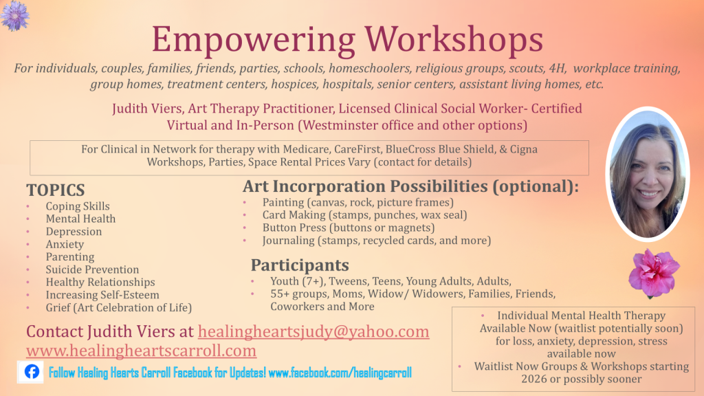 PLEASE CONTACT LAURA COULTER IF YOU ARE INTERESTED IN ORDER TO SCHEDULE YOUR WORKSHOP. HEALINGHEARTSCARROLL@YAHOO.COM OR BY CALLING 410-294-9612